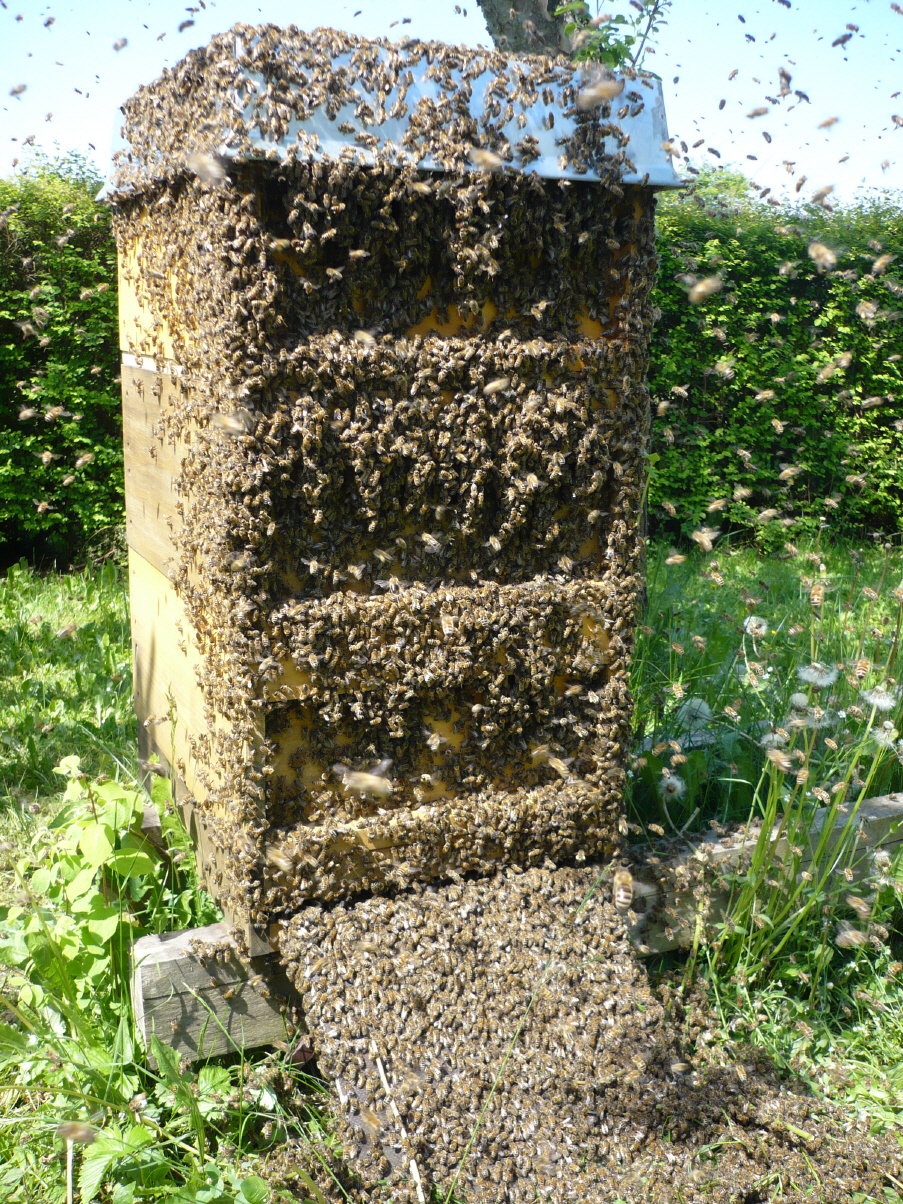 Am späten Vormittag eines sonnigen Tages im Mai herrscht reges Treiben am Bienenstand. Tausende Arbeitsbienen streben mit dicken Pollenhöschen an den Hinterbeinen und den Honigblasen voller Nektar zu ihren Stöcken.